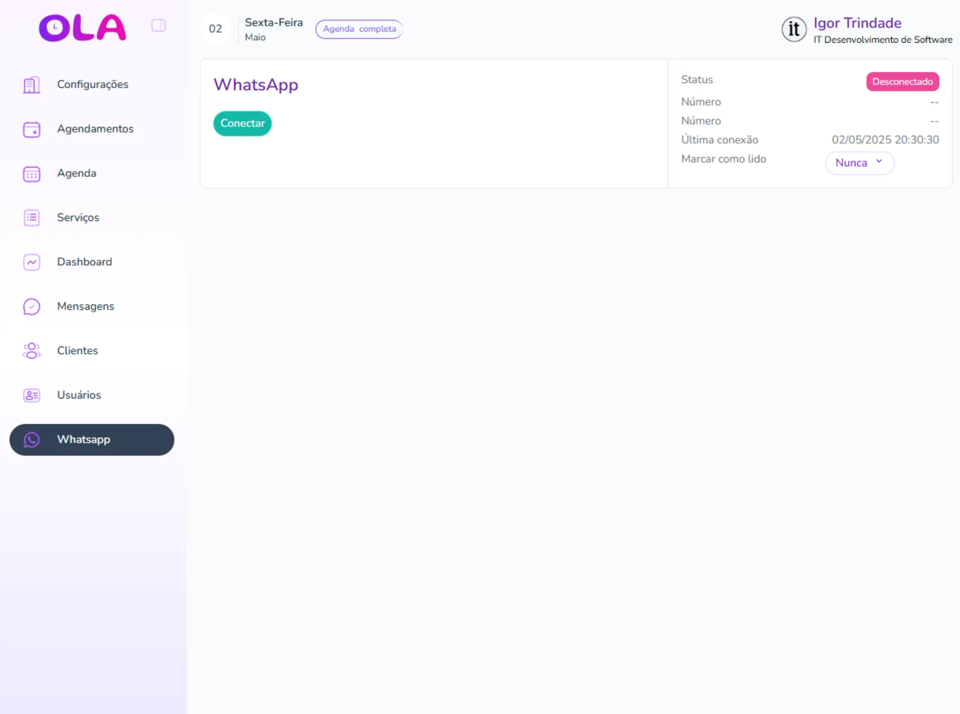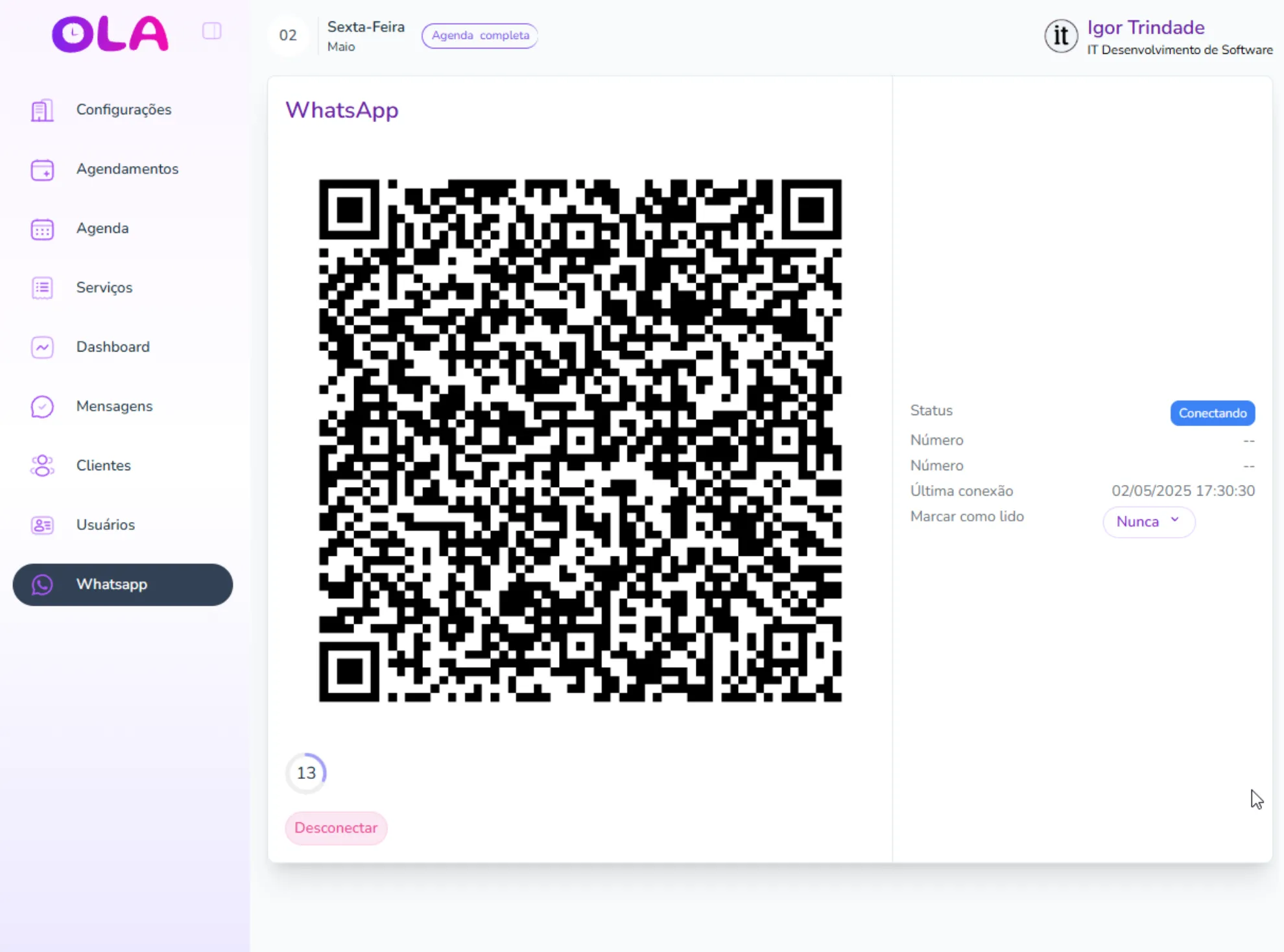 Agora volte para a plataforma Ola SecretarIA e inicie o modo conexão.
