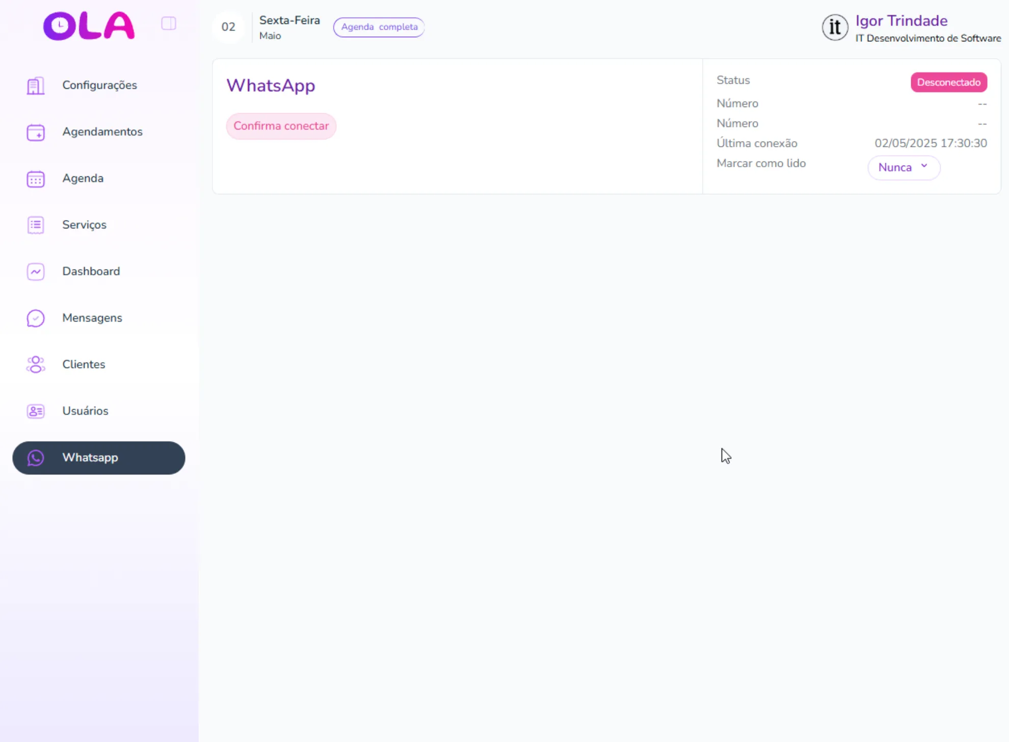 Na plataforma Ola SecretarIA no menu "WhatsApp", clique em "Conectar" e em seguida clique em "Confirma conectar"